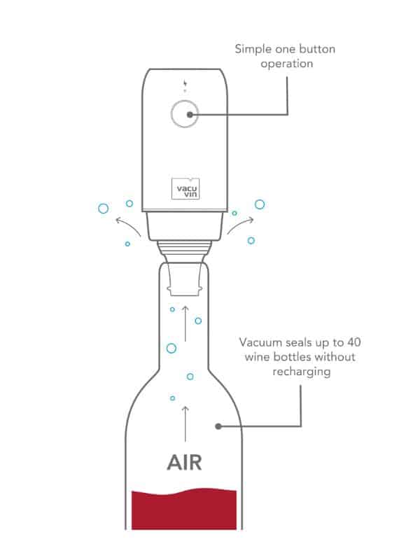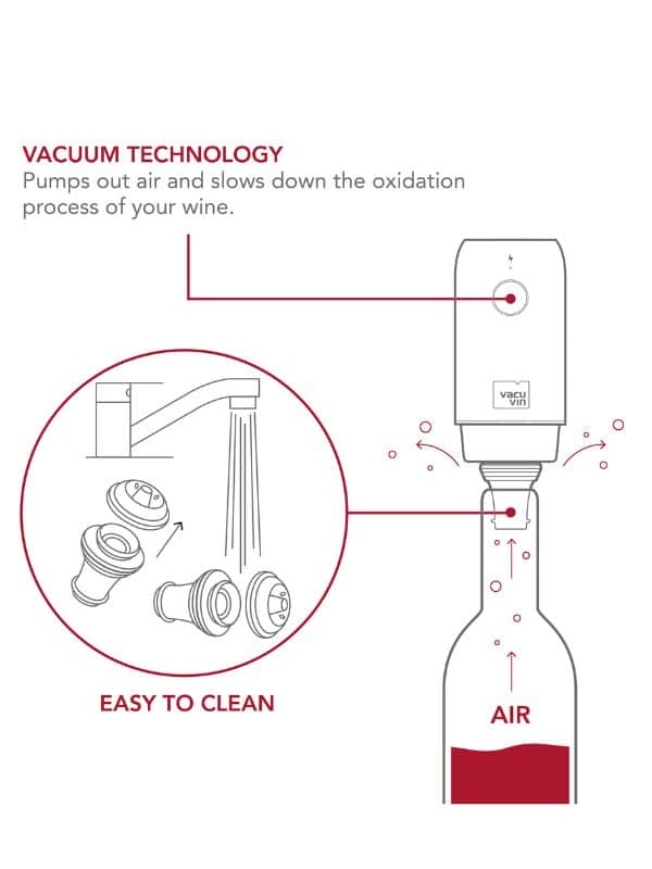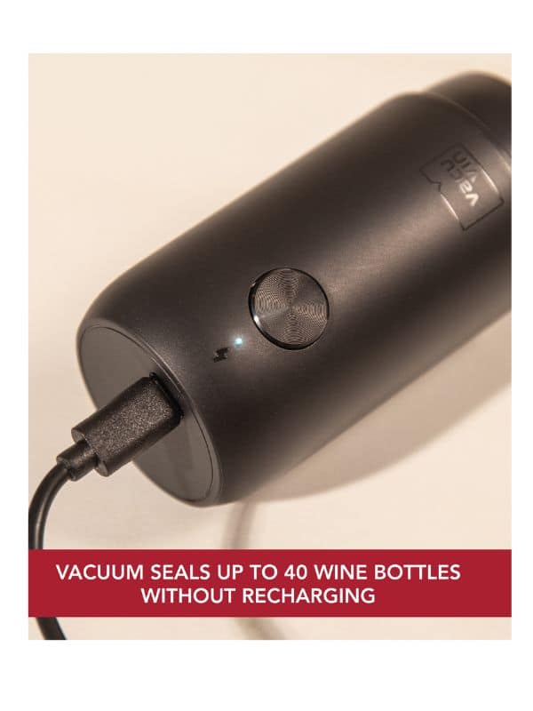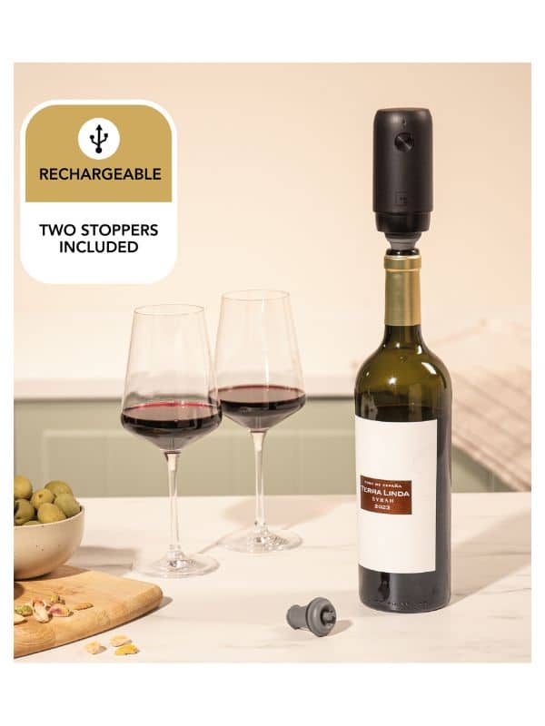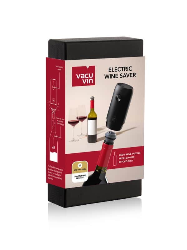 Grâce à la pompe à vin électrique Vacu Vin, conservez votre vin préféré plus longtemps. La pompe entièrement automatique crée un joint sous vide en quelques secondes par une simple pression sur un bouton, empêchant ainsi l’oxydation. Idéal pour ceux qui aiment savourer leur vin à leur propre rythme.
