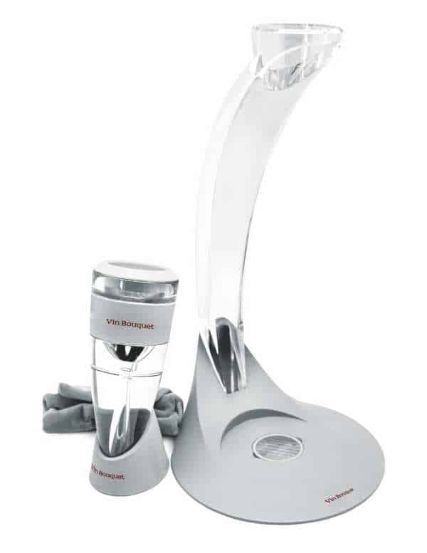 Filtre aérateur fourni avec un support permettant de poser le verre et l’aérateur, un tamis amovible et un sac velours