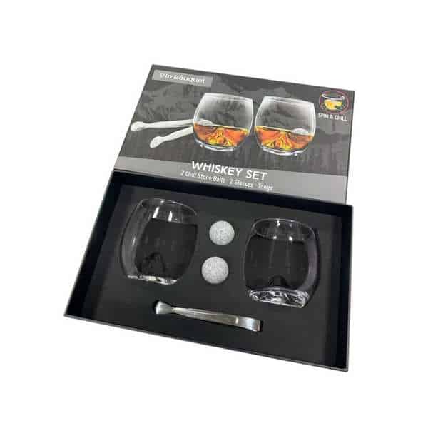 Set à whisky MONTAGNE relief comprenant : 2 verres à Whisky avec décor Montagne, 1 pince à glaçons et 2 glaçons « boule »en granit