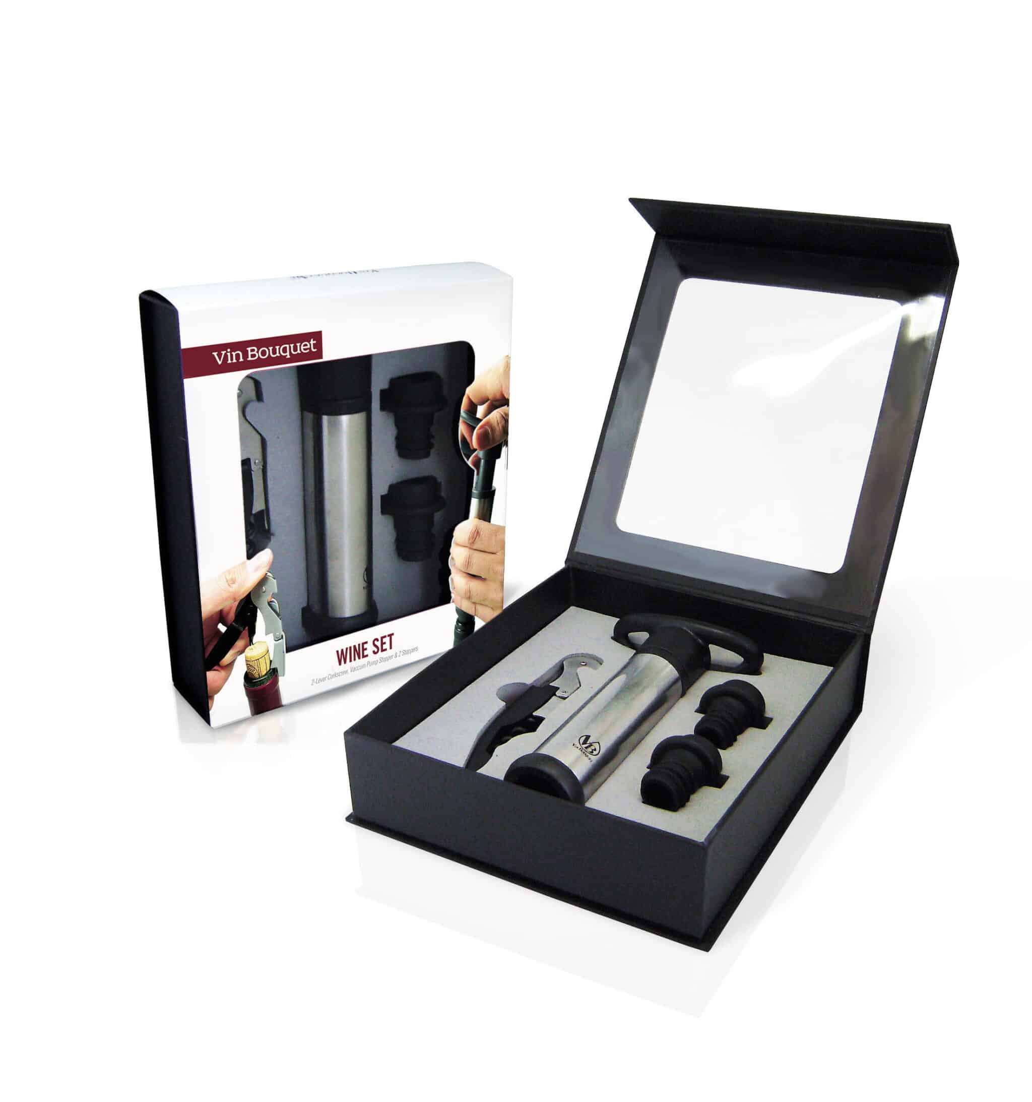 Contient : 1 pompe, 2 bouchons, 1 sommelier double levier noir