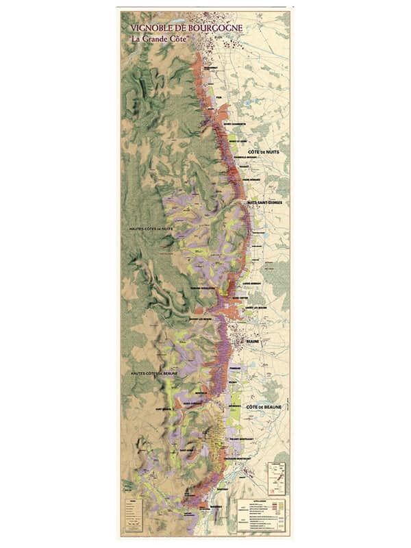 Toutes les communes de la Grande Côte avec une représentation réelle de leurs différents vignobles. Tous les Grands crus et les Premiers crus avec leur dénomination et leur situation. Toutes les appellations communales et régionale. Les vignobles des Hautes-Côtes et la liste de toutes les communes viticoles.