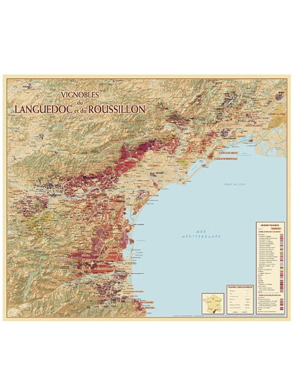 Toutes les appellations de ce trรจs grand vignoble qui va de la rive occidentale du Rhรดne ร  la frontiรจre espagnole. Les vignobles, qui รฉpousent les coteaux, sont reprรฉsentรฉs par le fond relief qui habille cette carte. Les vins blancs, rouges et rosรฉs, ainsi que les vins doux naturels.