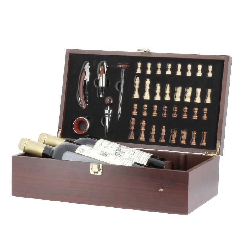 COFFRET BOIS PRESTIGE 5 ACCESSOIRES + JEU D’ECHEC (2 BOUTEILLES)