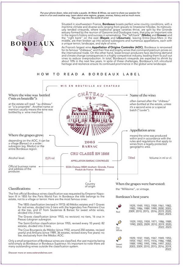 En déballant le puzzle, vous trouverez également des informations supplémentaires telles qu’un guide des étiquettes de vins de Bordeaux, un guide des styles de vins et des cépages de la région, ainsi que le profil des châteaux les plus légendaires de Bordeaux comme les Châteaux Margaux ou les Châteaux Mouton-Rothschild. Préparez-vous à explorer le célèbre Bordeaux et à vous adonner à une expérience déroutante sans pareille !