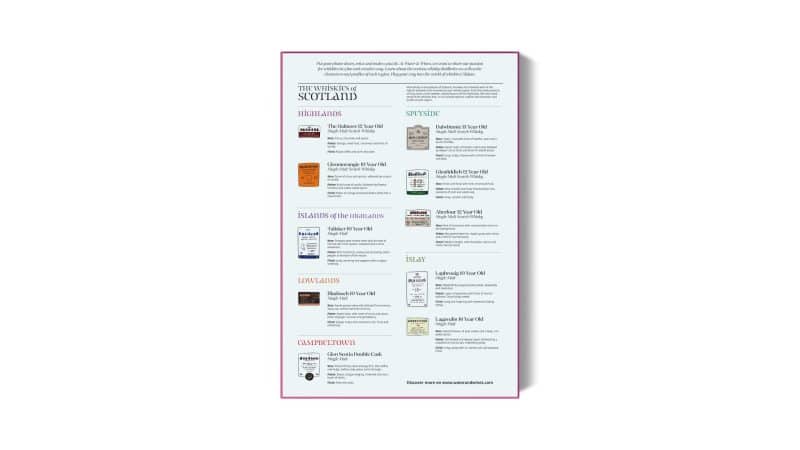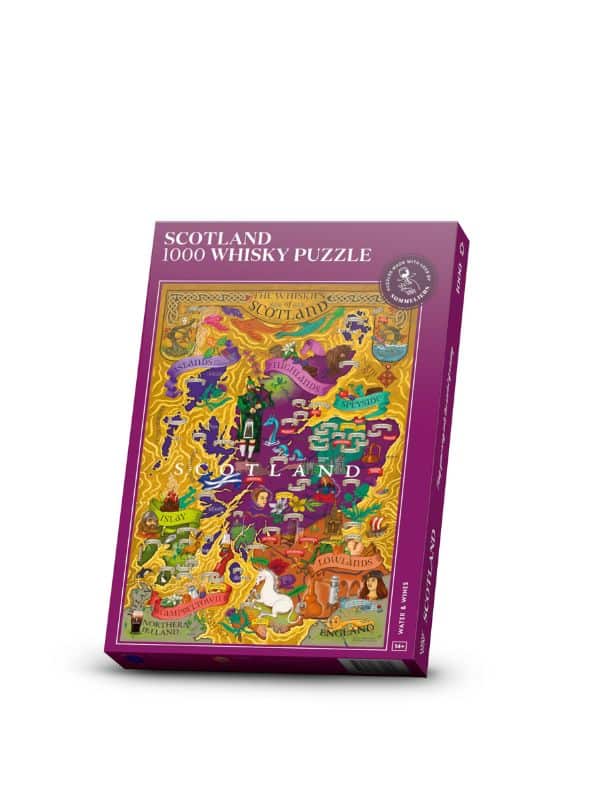 Soigneusement organisé, le Whisky Puzzle of Scotland explore les cinq régions du Scotch Whisky et leurs caractéristiques, chacune offrant une perspective différente sur l’élixir. La carte met en lumière la riche histoire du whisky écossais ainsi que les distilleries emblématiques, passées et présentes, gardiennes des secrets et des anciennes traditions qui ont fait la renommée du Scotch Whisky dans le monde entier. Le coffret présente le profil des whiskies écossais single malt emblématiques ainsi qu’une introduction à la dégustation de whisky. Illustré à la main, le design a soigneusement été visé par certains des meilleurs experts en whisky au monde.
