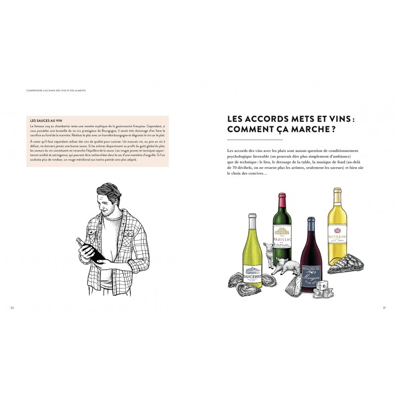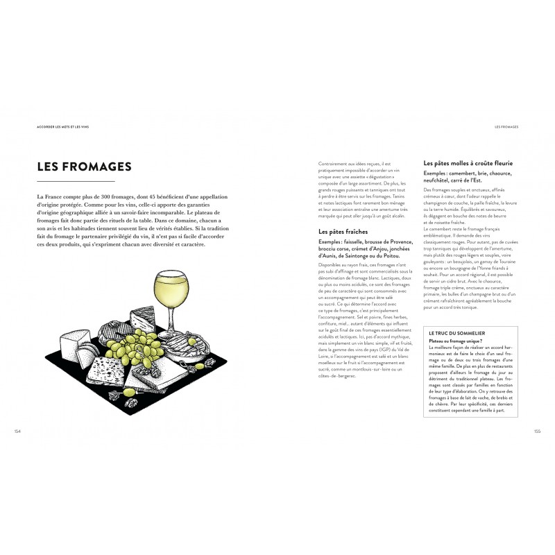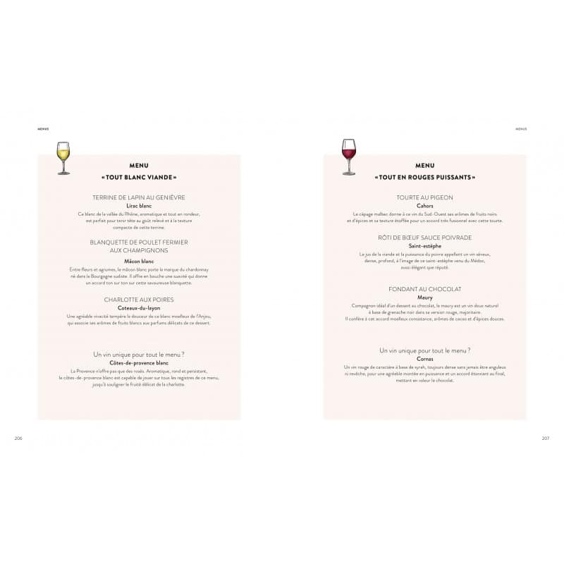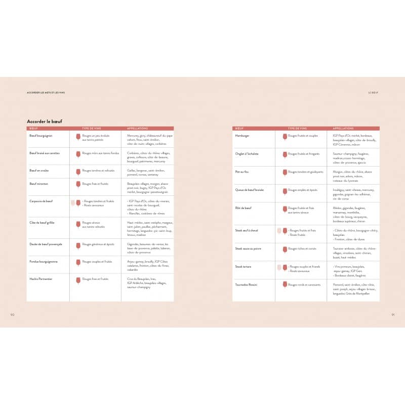 De l’apéritif au dessert, 2 500 accords sont expliqués en fonction du mode de cuisson, de l’accompagnement, de la sauce, des épices… Pour chaque famille de produits, un taleau récapitulatif permet un repérage facile.