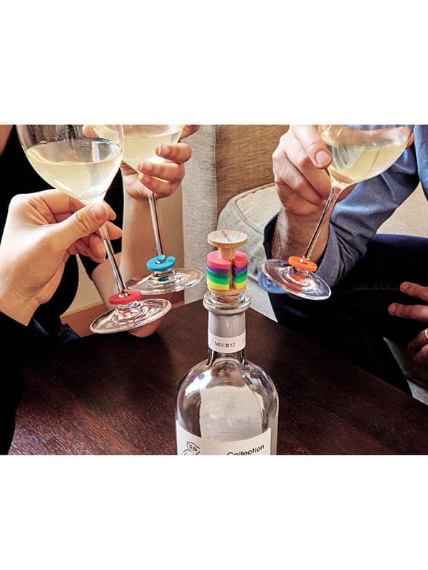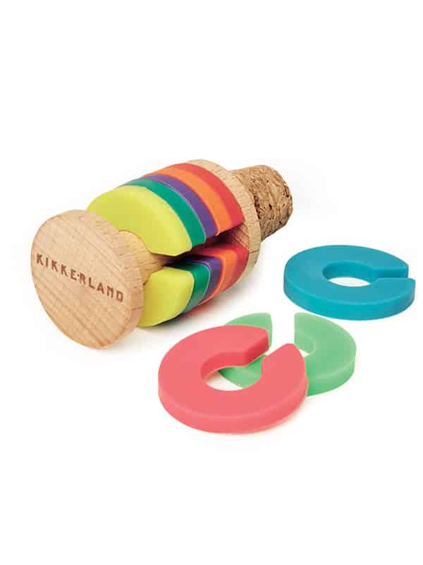 MARQUE-VERRES A CLIPSER BAGUES ARC EN CIEL ET BOUCHON LIEGE (lot de 8 bagues)